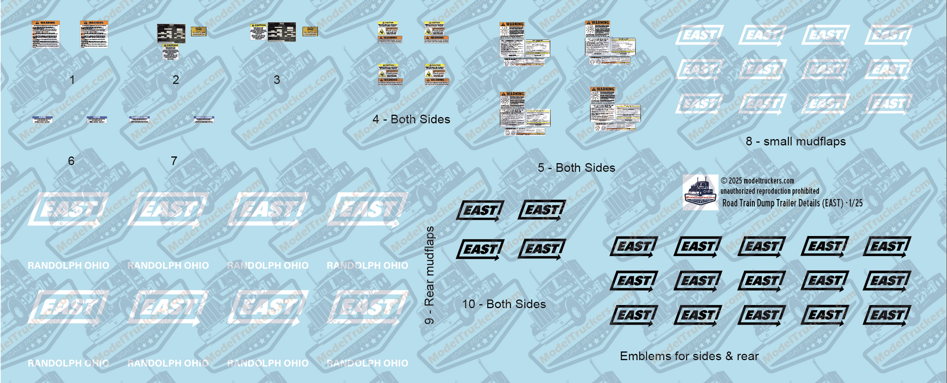 Waterslide decals to detail a Michigan Road Train style dump trailer. Comes with warning and caution labels to add realism to your model. Comes with label placement guide sheet. Chose manufacturer for proper mud flaps and emblems.