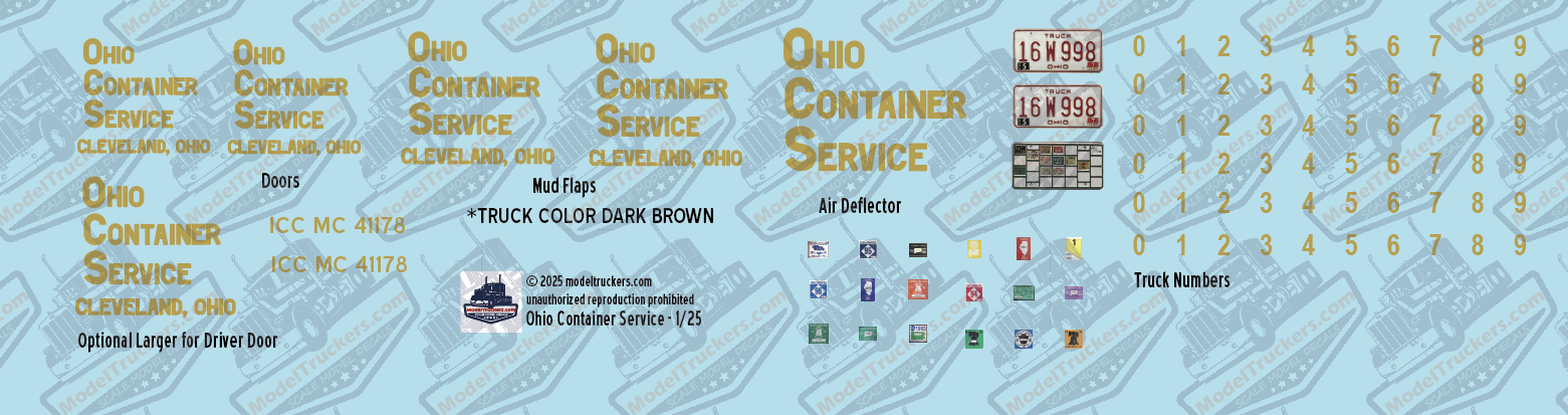 Waterslide decals for scale model semi truck only of the Ohio Container Service company.