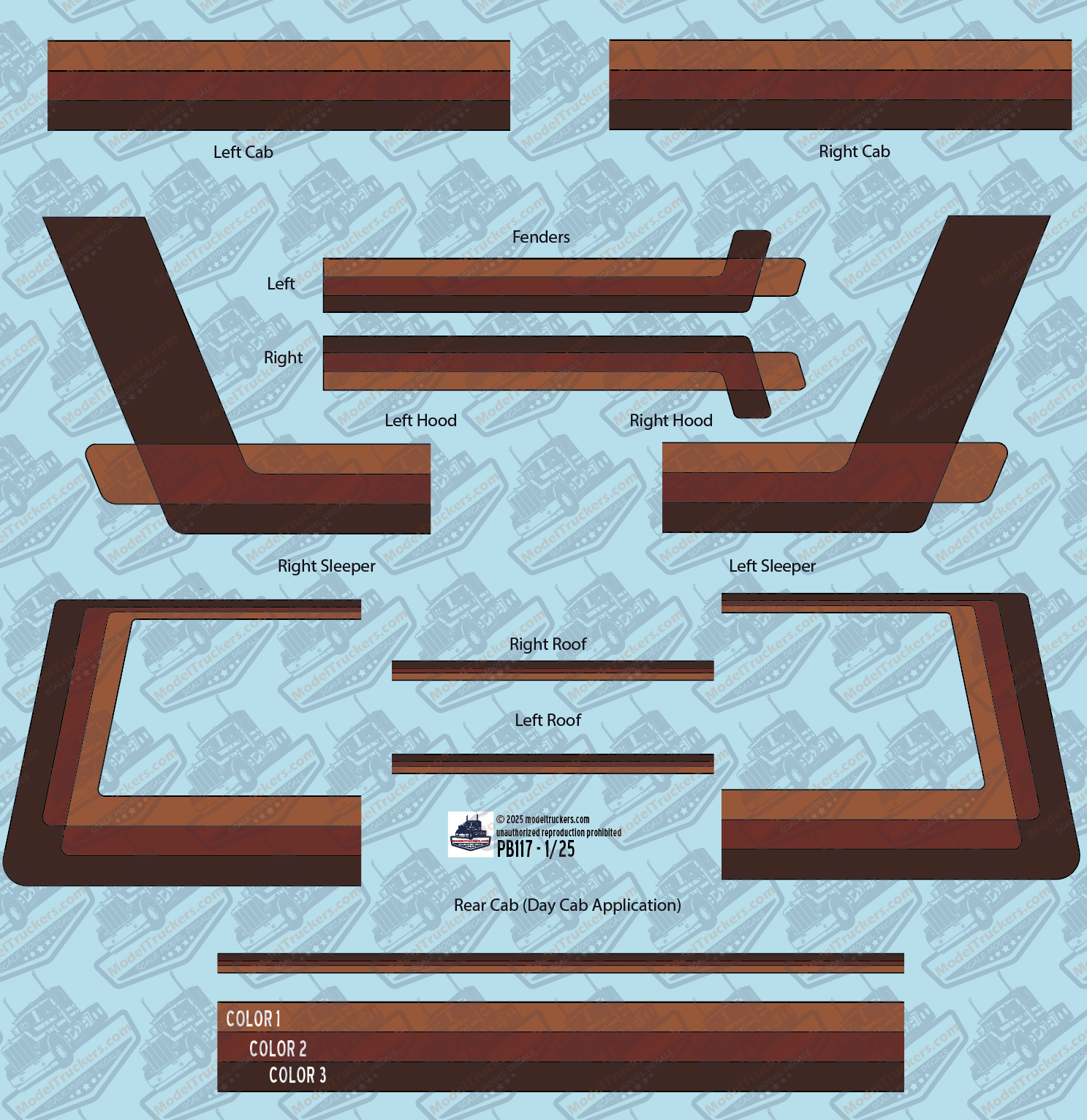 Give your Peterbilt truck a customized look with our factory stripe waterslide decals. Choose your color scheme from the options below. You must make a selection per choice. Designed for conventional trucks. *RECENTLY REVISED SET to be more accurate.