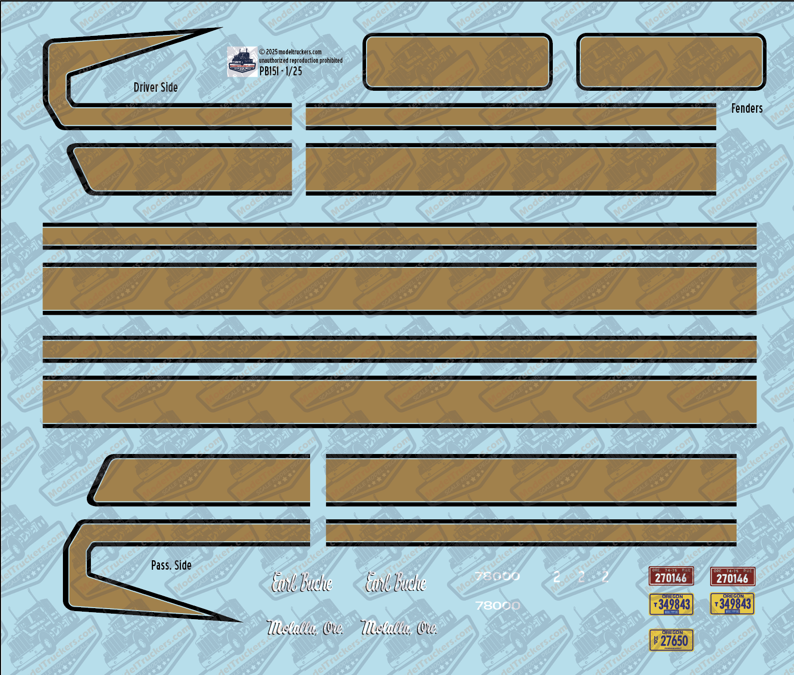 Give your scale model truck a customized look with our stripe waterslide decals. Good for all conventional truck makes. Choose your color scheme from the options below. You must make a selection per choice. Trucking with Class brochure design with Earl Buche script. Color 1 is the primary stripe.
