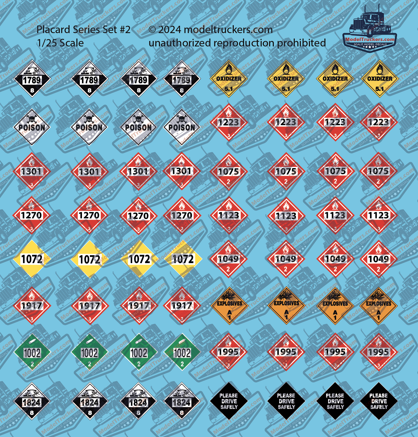 Waterslide decals of trailer placards to enhance detail your model semi truck and trailer. Set #2 includes non-flammable gasses, flammable materials, explosives, oxidizers, poison, and corrosive placards. Large sheet for many trucks and trailers.
